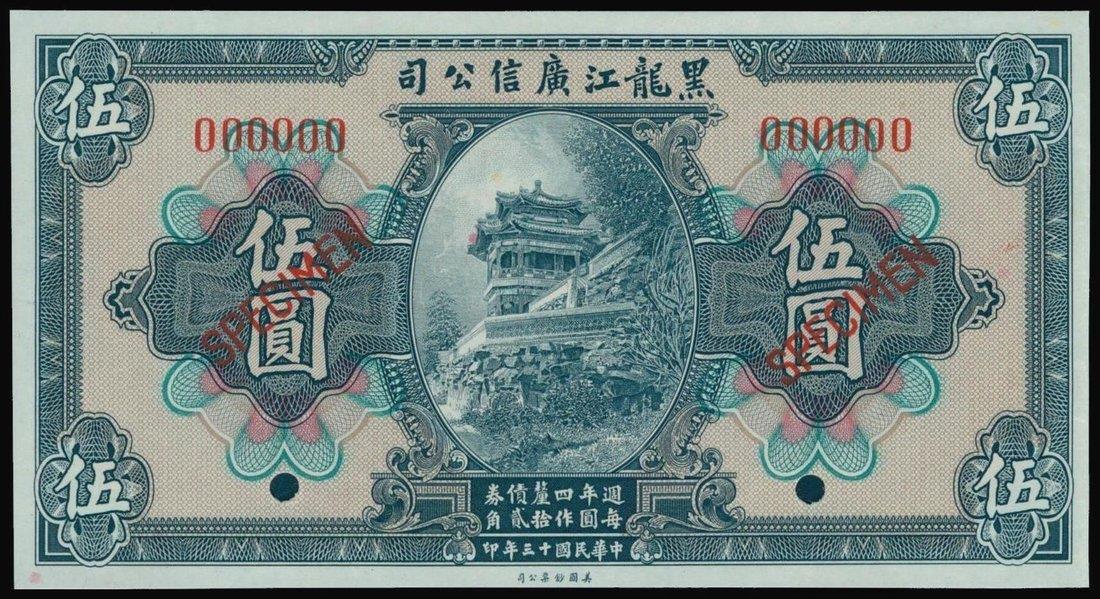 The Kwang Sing Company (Heilungkiang), $5, specimen, 1924, serial number 000000, black on orange-brown and multicolour, pavilion on rocky hillside at centre, the ABNC Bond Issue,
