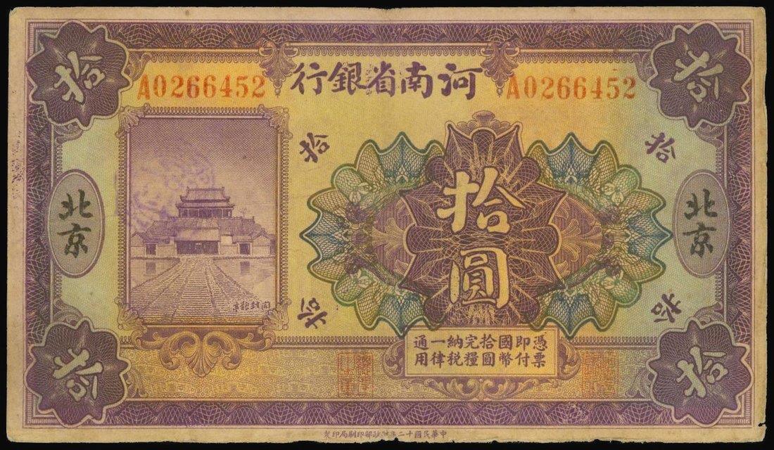 Provincial Bank of Honan,10 yuan, 1923, Peking, serial number A0266452,purple on multicolour underprint, temple at left, reverse green,
