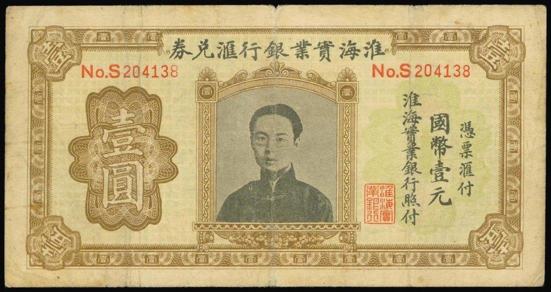 Hwei Hai Industrial Bank,$1, ND, serial nm]umber S204138,brown on light green, portrait of a man at centre, reverse blue,