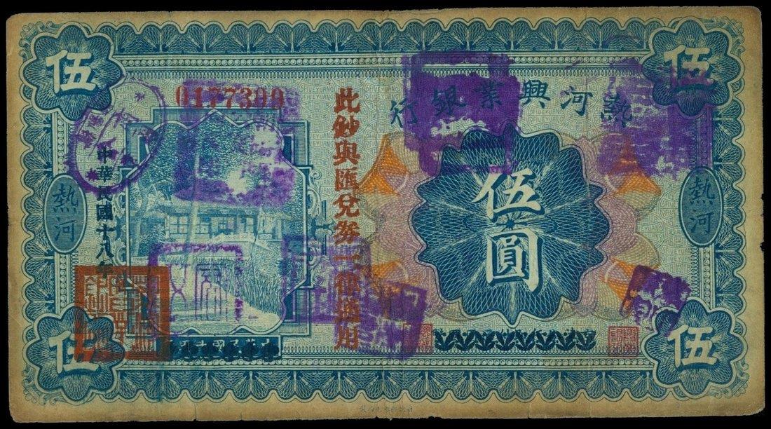 The Industrial Development Bank of Jehol,5 yuan, 1929, serial number 0177309,blue and multicolour, multiple official blue stamps on obverse, reverse blue,