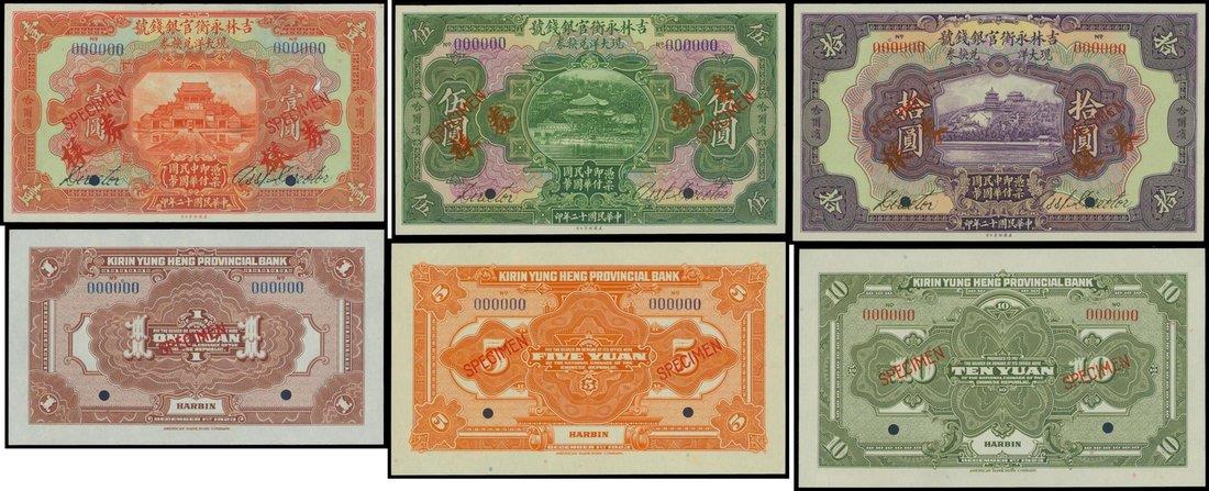 Kirin Yung Heng Provincial Bank, set of 3 uniface obverse and reverse specimens of the 1923 issue for use in Harbin, 1, 5 and 10 yuan, orange, green and purple respectively, various Chinese style buildings at centre,