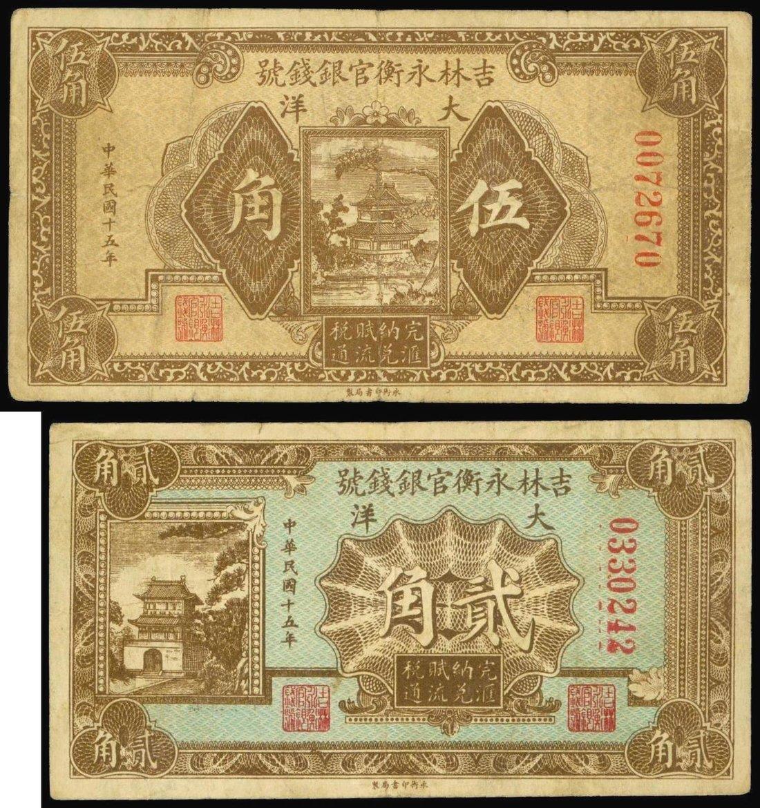 The Yung Heng Provincial Bank of Kirin,20 and 50 cents, 1926,brown and blue, brown and yellow respectively,