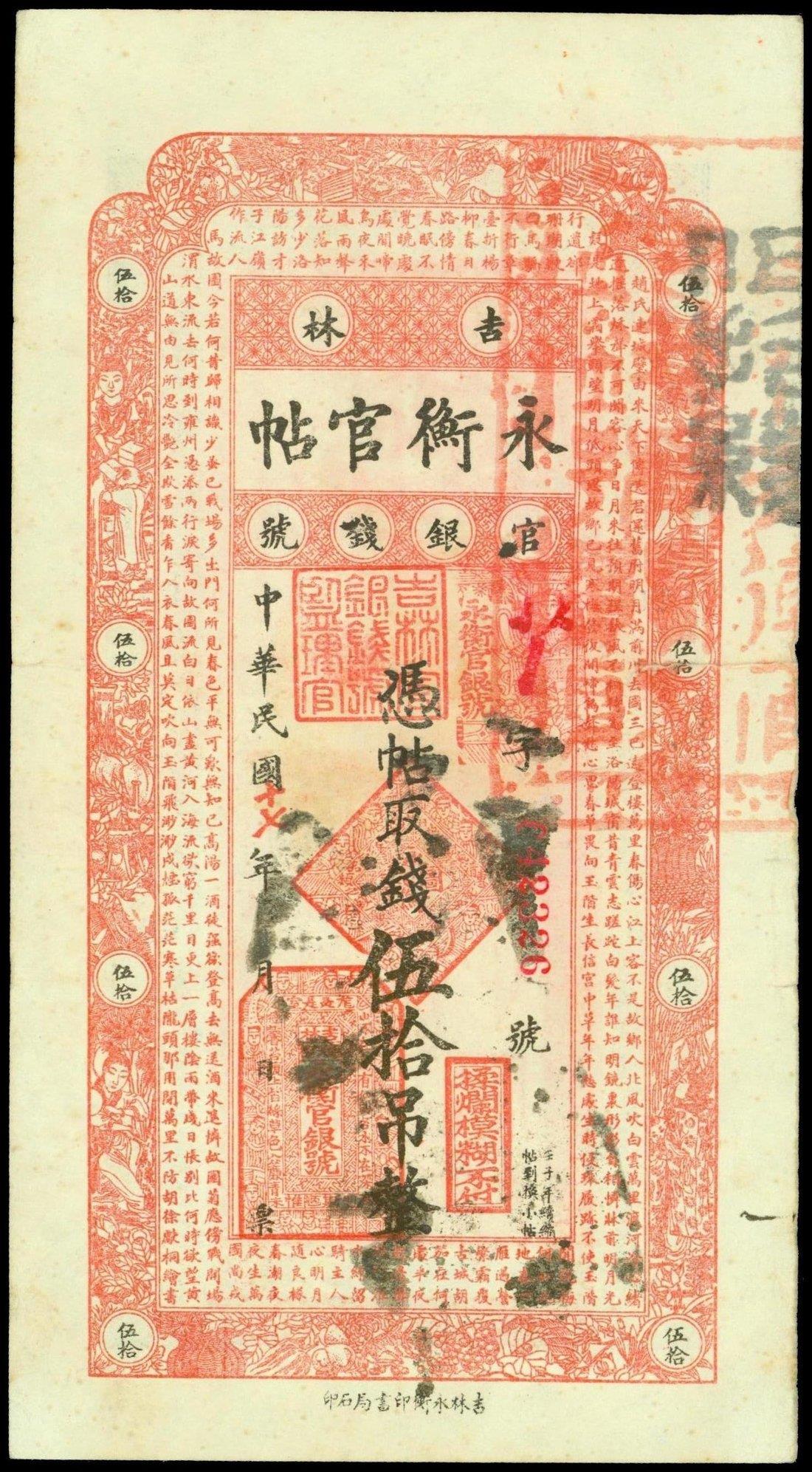 Yung Heng Provincial Bank of Kirin,50 tiao, 1928, serial number C 42326,vertical format, red, black text, red seals, floral ornate border with Chinese figures, reverse blue and red, large red seals,