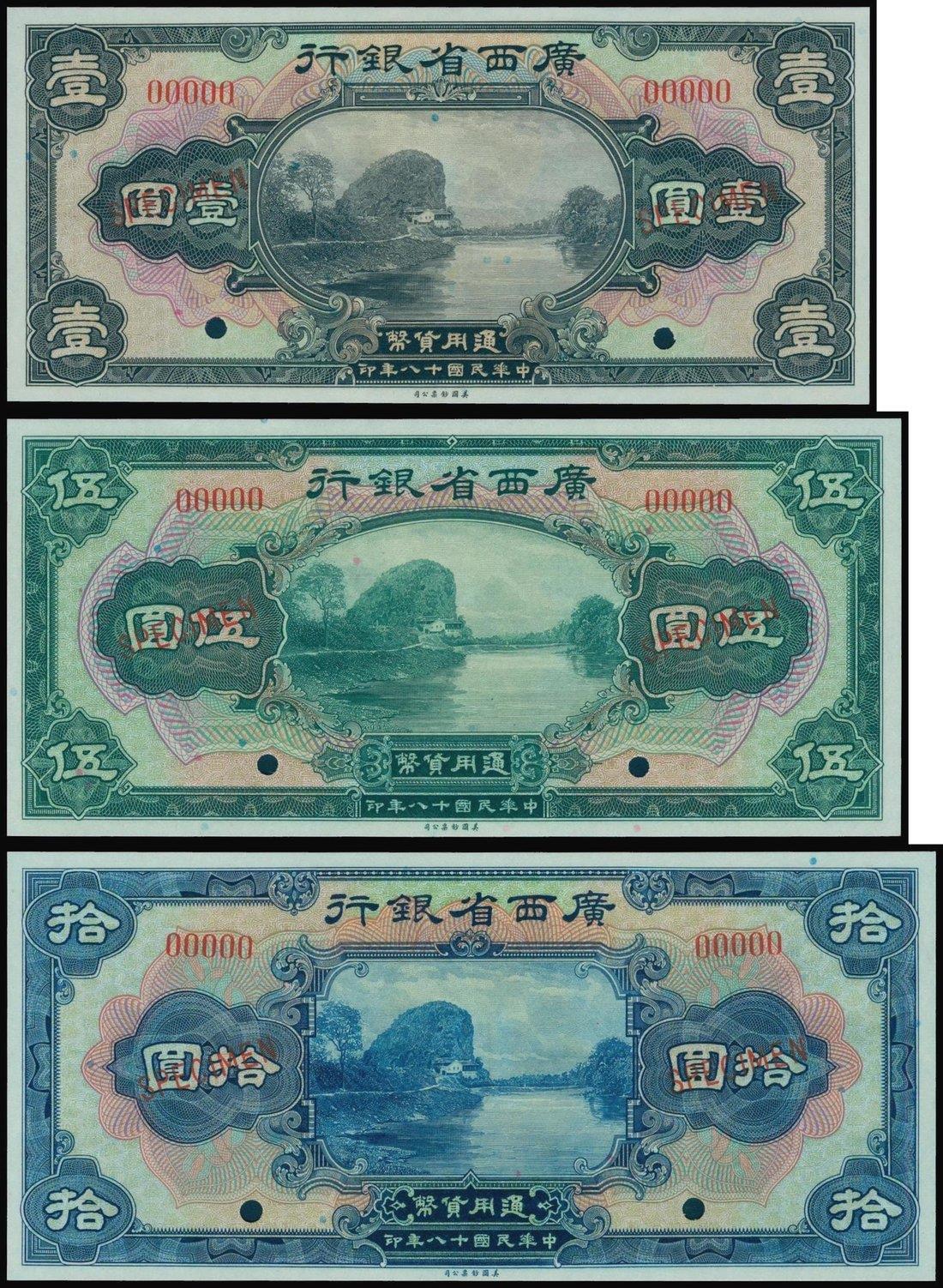Provincial Bank of Kwangsi, set of 3 specimens of the 1929 series, $1, $5 and $10, black, green and blue, river and mountain scene at centre, hole punch cancelled, 'SPECIMEN' overprinted in red,