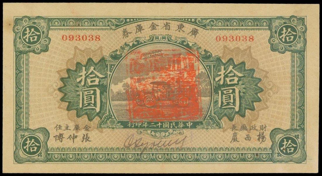 Kwangtung Provincial Treasury,$10, 1923, serial number 093038,green on grey brown, automobile at centre, large red seal, reverse green, blue and orange stamps with Chinese characters,