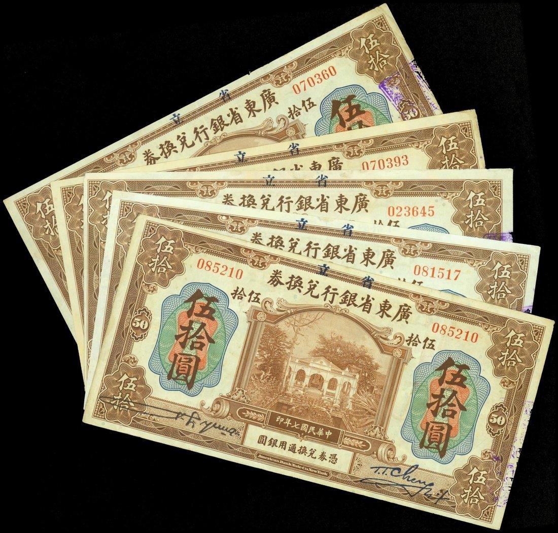 The Provincial Bank of Kwangtung Province,a lot of 5 x $50, 1918,brown and multicolour, pavilion and pool at centre, reverse olive,
