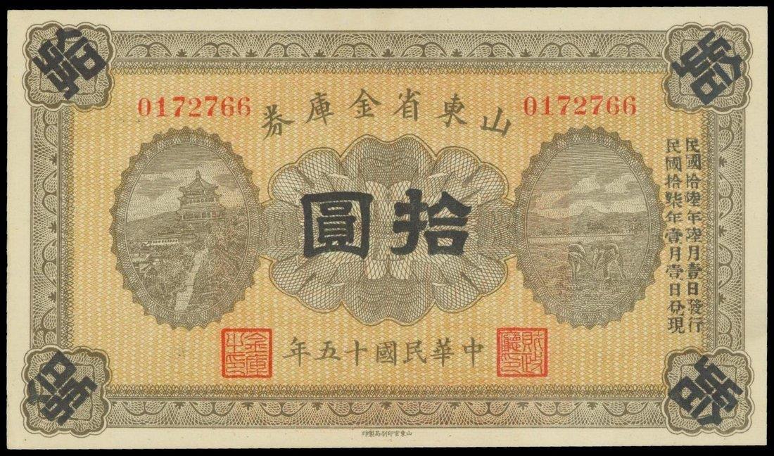 Shantung Provincial Treasury,10 yuan, 1926, serial number 0172766,grey and brown, house at left, gardening at right, reverse grey, large red seal overprinted at centre,