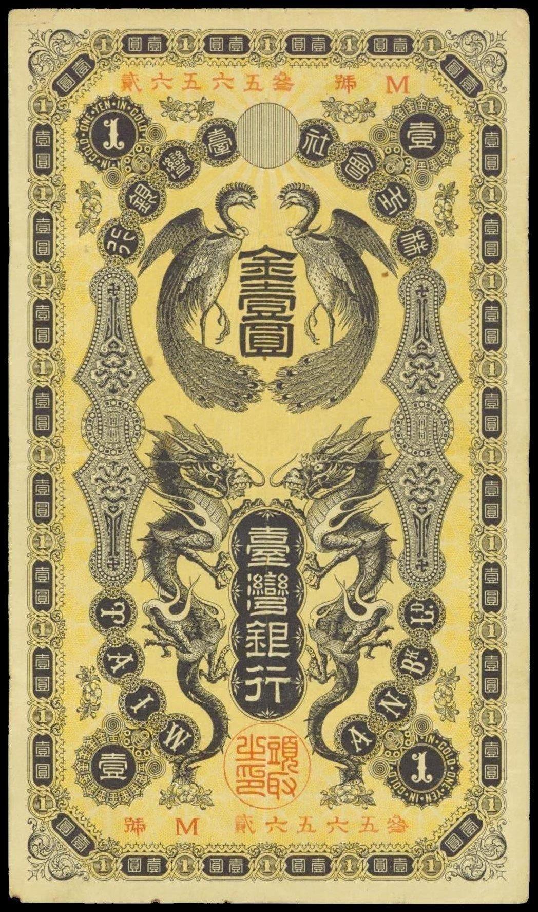 Bank of Taiwan,1 yen in gold, ND(1904), serial number 356562,vertical format, black on yellow underprint, facing Onagadori cockerels at top, facing dragons below, reverse purple,