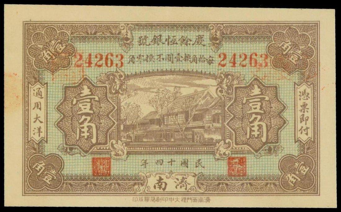 Private Issue, Chin Yu Heng Bank,1 chiao, 1925, Tsinan, serial number 24263,,small format, brown on pale blue underprint, village house at centre, reverse olive, houses by Great Wall at centre,