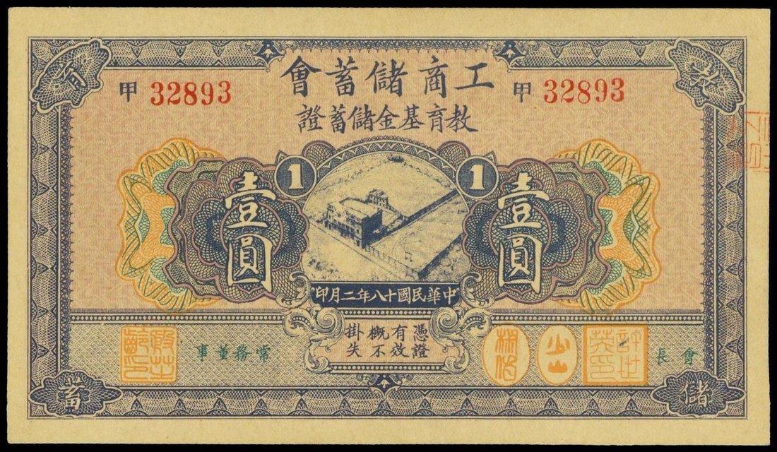 Industry and Commerce Saving Society, Shanghai,a saving certificate for Education Fund, 1 yuan, 1929, serial number 32893,grey-violet and multicolour underprint, school building at centre, reverse pink on pale green, text in Chinese,