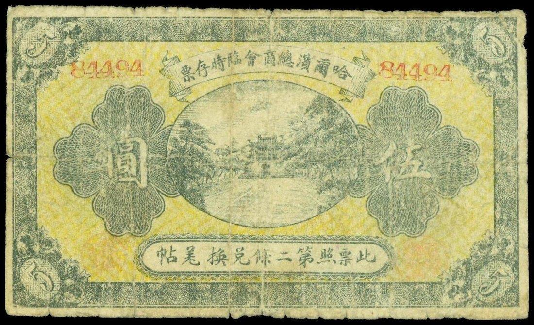 Harbin Chambre of Commerce,5 yuan, 1919, serial number 84494,green on yellow underprint, Chinese building and trees at centre, reverse green, Chinese text,