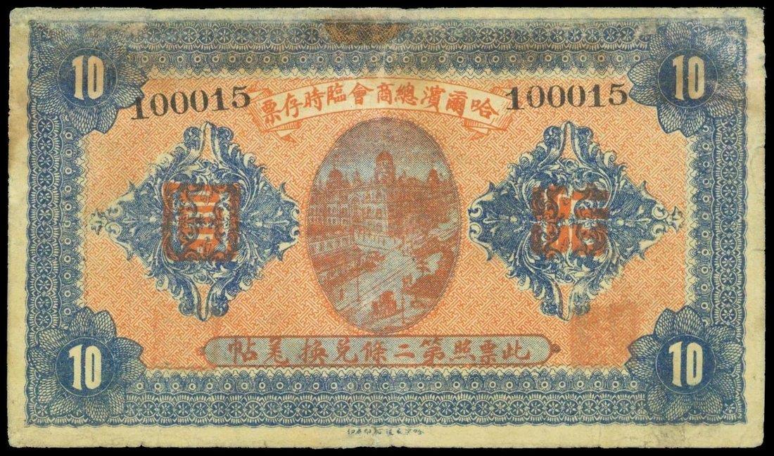 Harbin Chambre of Commerce,10 yuan, 1919, serial number 100015,blue on orange underprint, city view at centre, reverse red, Chinese text,