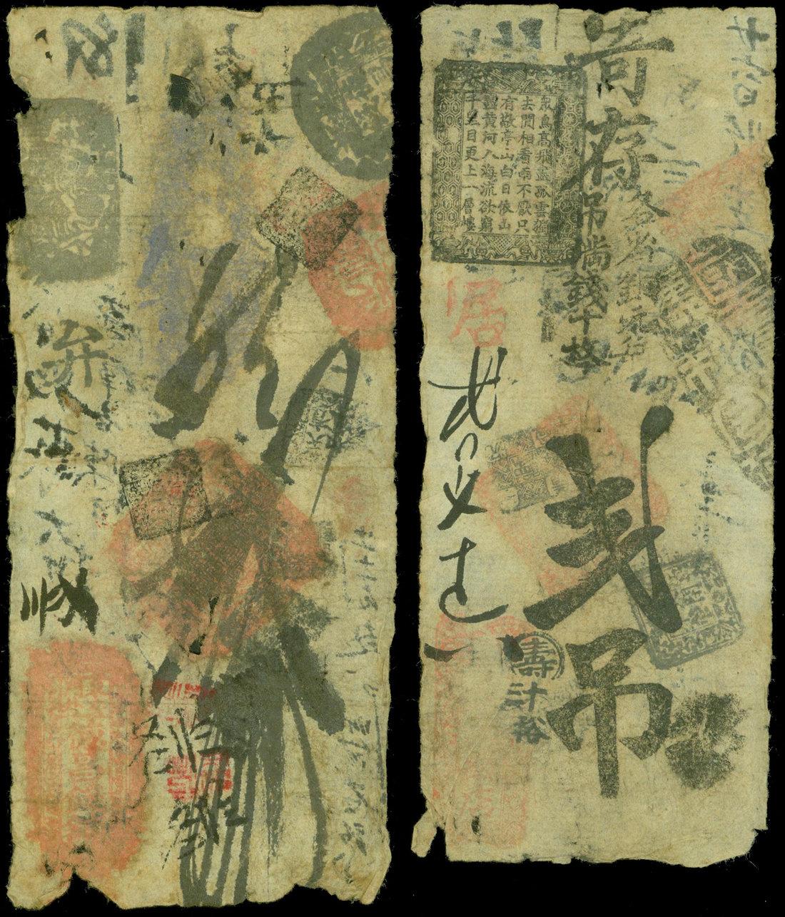Private Bank, Qing dynasty,lot of 2 notes, 2 tiao, small vertical format, brush writings, black and red seals,