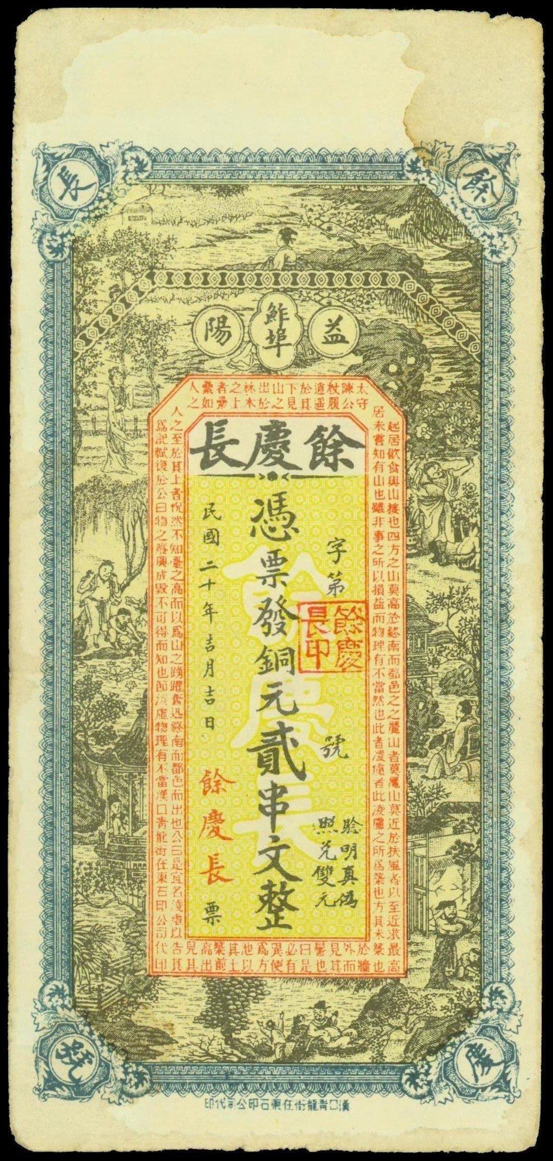 Private Issue, Yu Qing Chang,2 chuan cash, 1931, vertical format, blue, black, red and green, tradition Chinese figures on ornate border, reverse red,