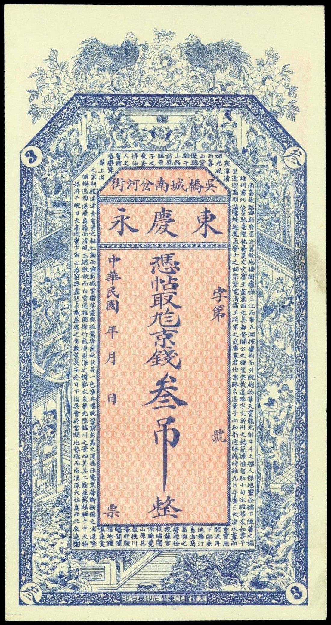 Private Issue, Dong Qing Yong,3 tiao, Republican era, remainder,blue and red, two roosters standing on flowers at top centre, Chinese figures and landscape in ornate border, reverse red, value at centre, gateway at bottom below,
