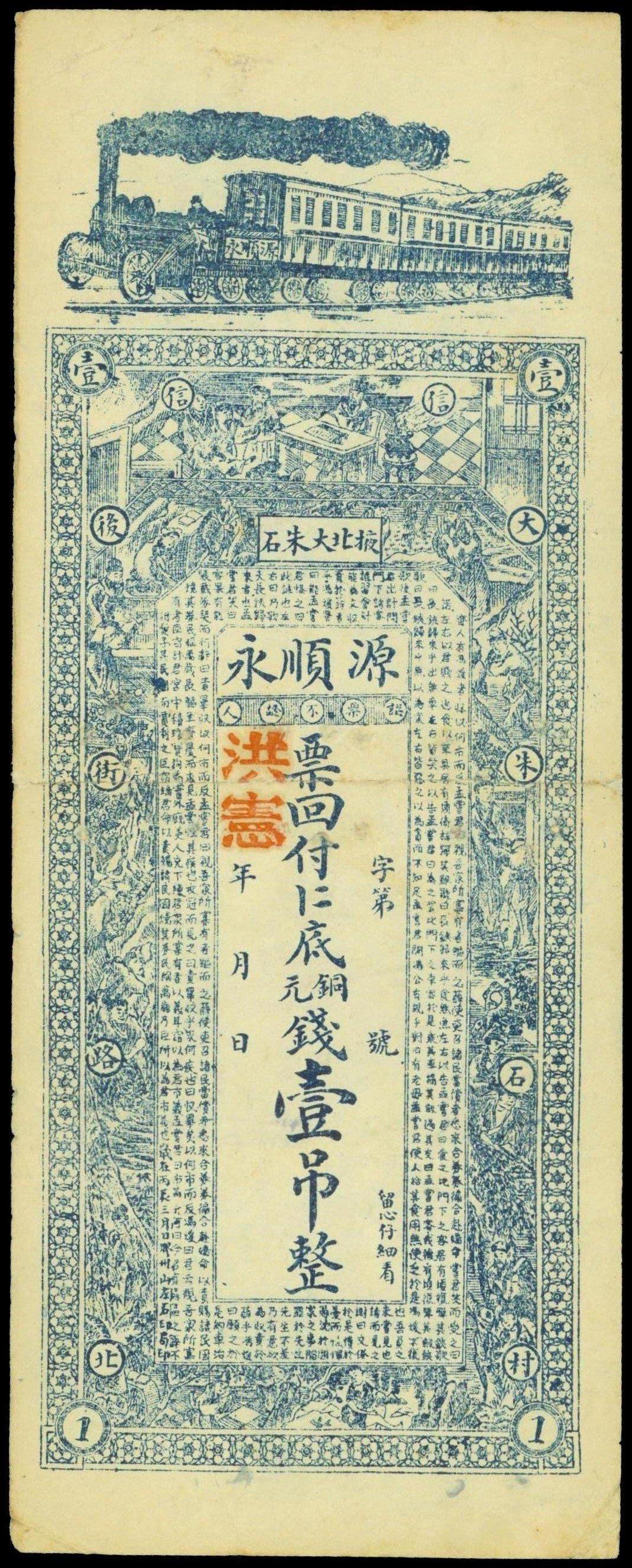 Private Issue, Yuan shun Yong,1 tiao, year of Hong Xian(1916), remainder,blue, vertical format, steam train at top, Chinese figures and landscape in ornate border, red Chinese characters ‘Hong Xian’ overprinted, reverse red, ink writing,