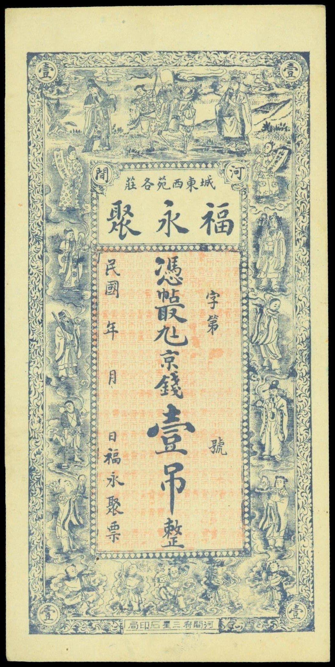Private Issue, Fu Yong Ju,1 tiao, Republican era, unissued, vertical format, blue on pink underprint, Chinese the eight immortals on ornate border, reverse pink,