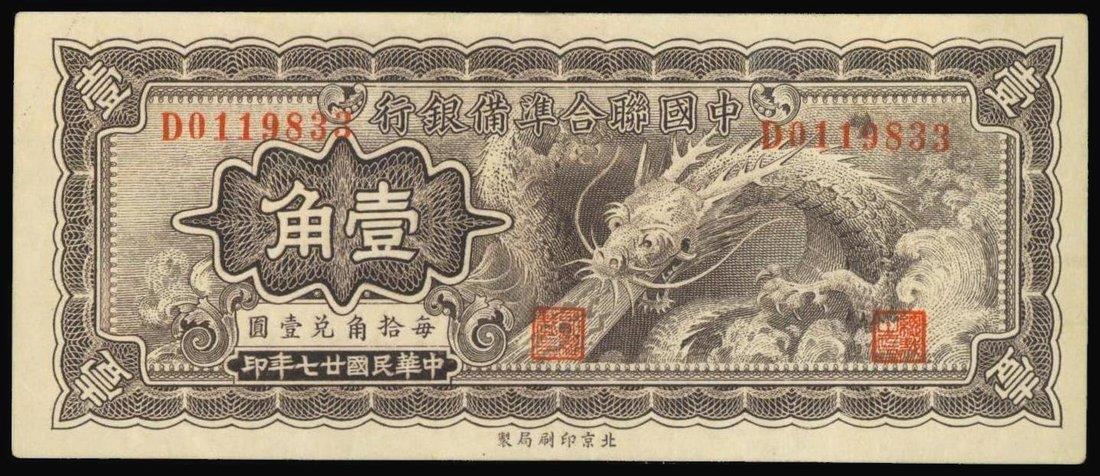Federal Reserve Bank of China,10 cents, 1938, serial number D0119833,brown, dragon at right, value at left, reverse brown,