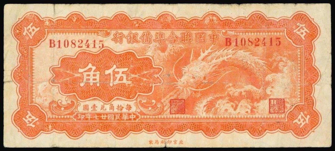 Federal Reserve Bank of China,50 cents, 1938, serial number B1082415,orange, dragon at right, value at left, reverse orange,