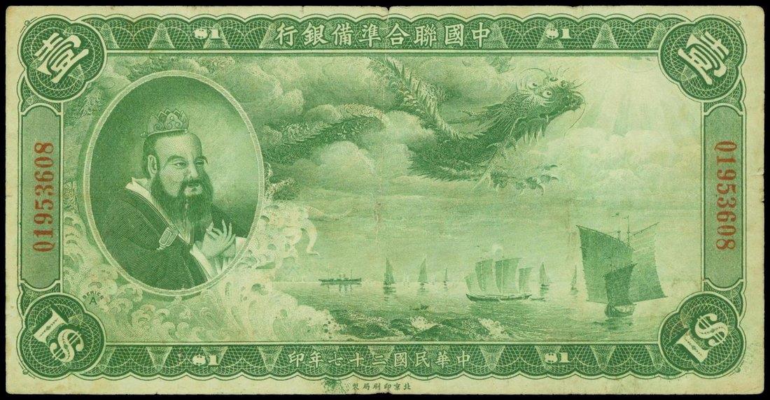 Federal Reserve Bank of China,$1, 1938, serial number 01953608,green, Confucius at left, junks at low centre right, dragon at above, reverse green,