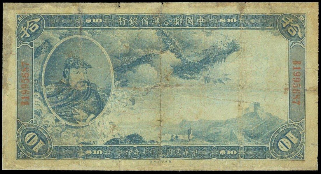 The Federal Reserve Bank of China,$10, 1938, serial number B1995687,blue, Kuan Yu at left, Great Wall at lower right, dragon at above, reverse blue,