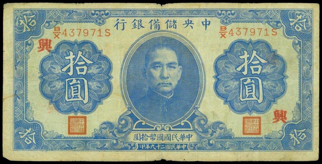 The Central Reserve Bank of China,10 yuan, 1940, serial number B/X 437971S,bright blue on light green underprint, Sun Yat Sen at centre, Chinese characters overprinted at top left and low right, reverese blue,