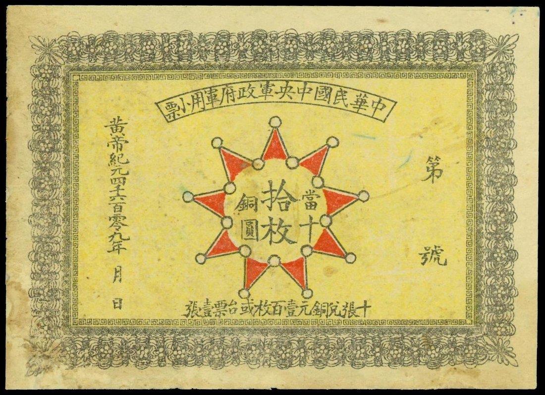 Central Chinese Republic Army Government Note,10 coppers, 1912, unissued note,black and yellow, star-like vignette at centre stating value, reverse brown with Chinese text,