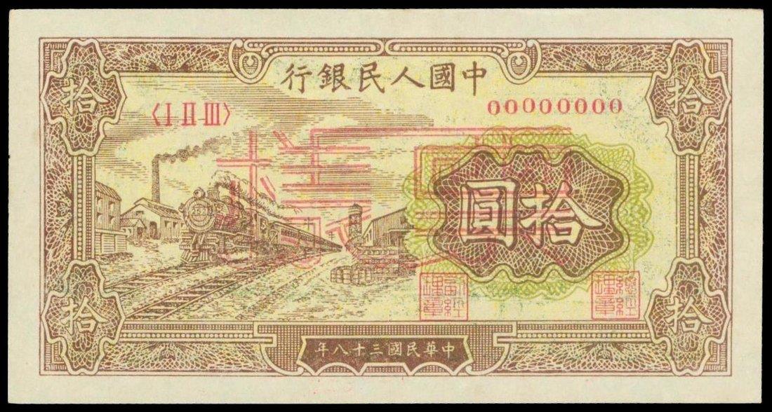 People’s Bank of China,1st series renminbi, 10 yuan, specimen, 1949, control number 015652,brown on yellow-green, train at left,