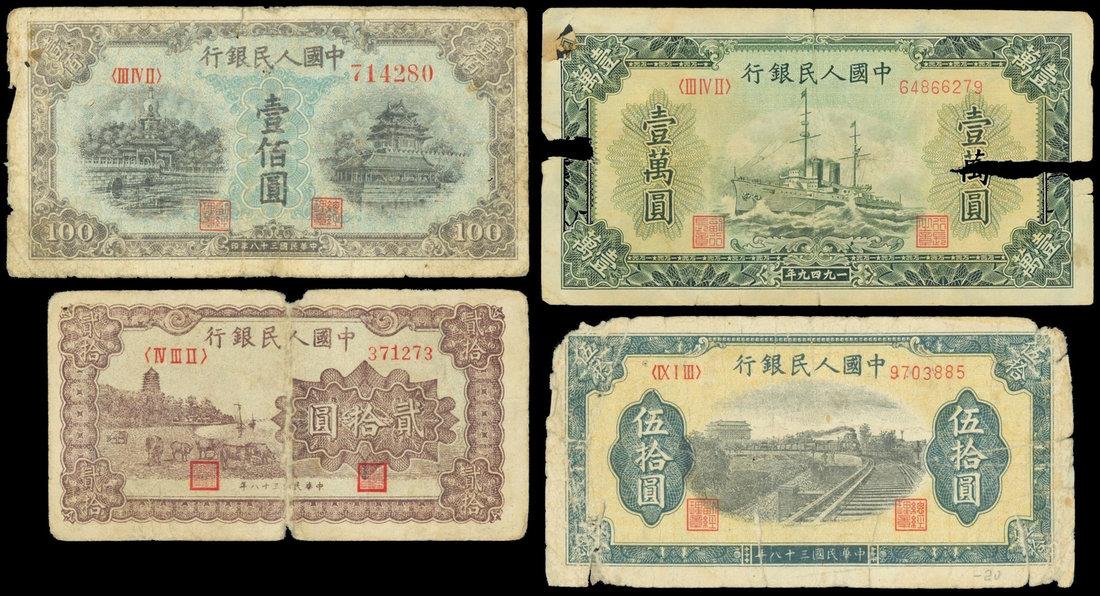 People's Bank of China, 1st series renminbi (1948-1949), lot of 4 notes, 20 yuan, 'Brown Liu He Pagoda', 50 yuan 'Train', 100 yuan 'Blue Bei Hai Bridge' and 10,000 yuan 'Warship',