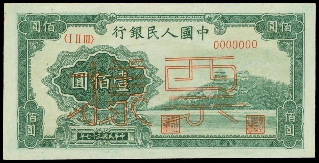 People’s Bank of China,1st series renminbi, 100 yuan, specimen, 1949, control number 0019931,green, pagoda at right on obverse,