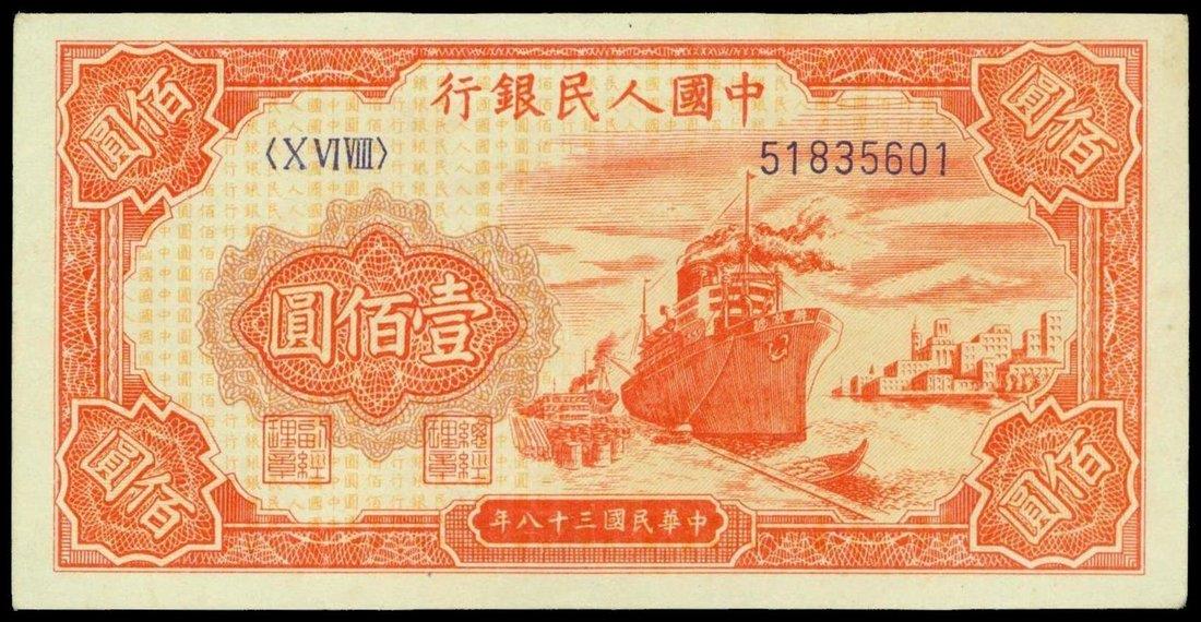 People’s Bank of China,1st series renminbi, 100 yuan, 1949, serial number X VI VIII 51835601,orange-red, ship at quayside at right,