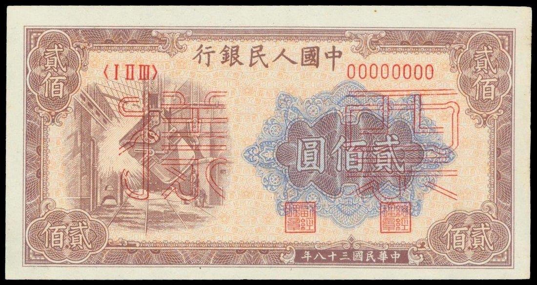People’s Bank of China,1st series renminbi, 200 yuan, specimen, 1949, control number 00010776,brown on yellow-red and blue, steel plant at left,