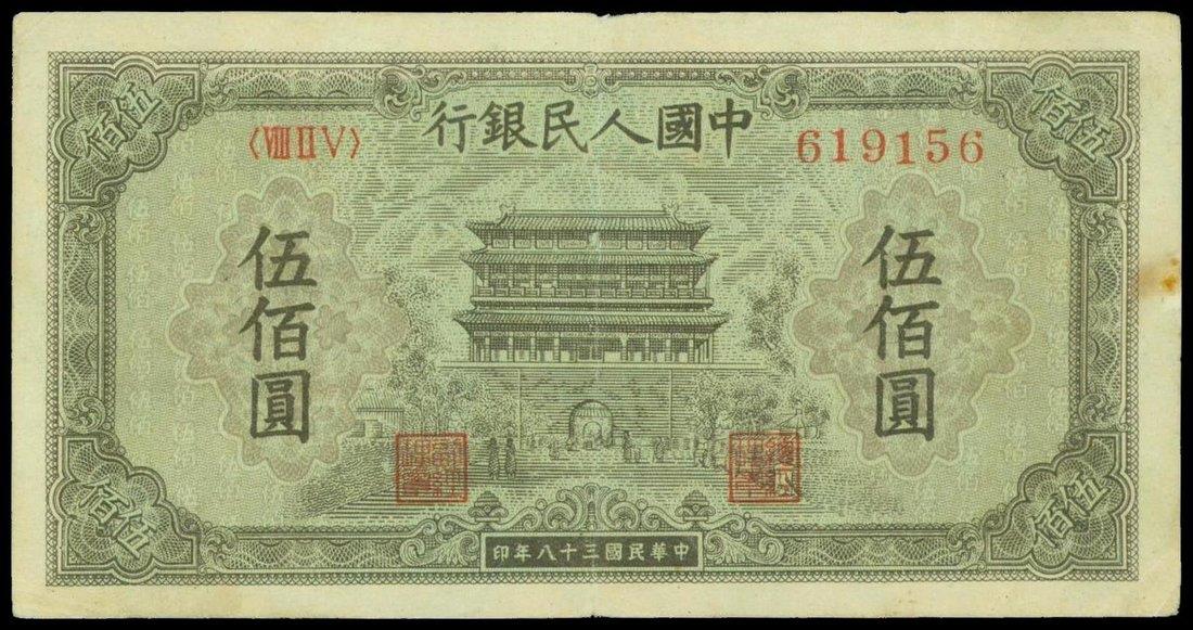 People’s Bank of China,1st series renminbi, 500 yuan, 1949, serial number VIII II V 619156,dark brown on lilac and light blue underprint, city gate Zheng Yang Gate at centre,