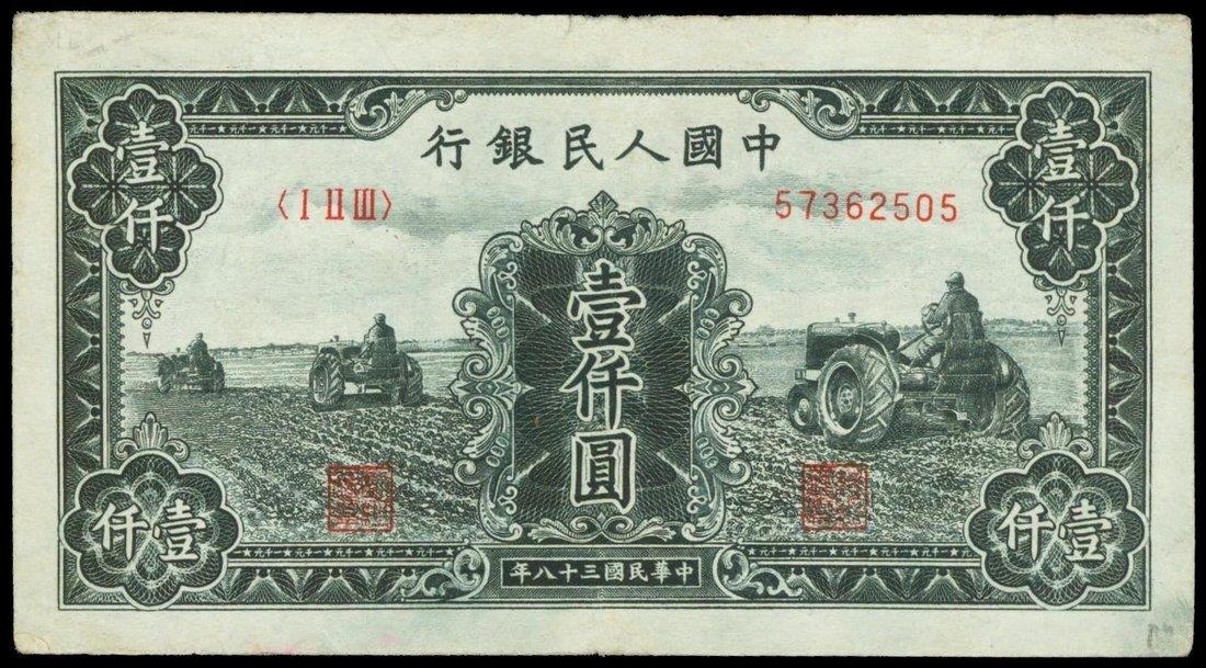People's Bank of China, 1st series renminbi (1948-1949), 1000 yuan, serial number 57362505, 'Three Tractors',