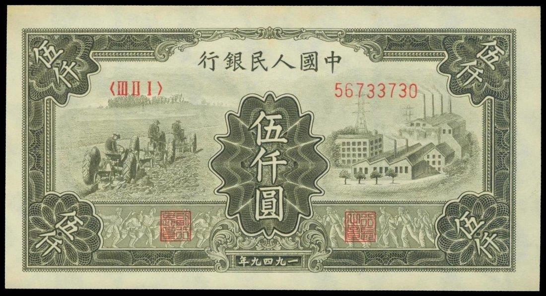 People's Bank of China, 1st series renminbi (1948-1949), 5000 yuan, serial number 56733730, 'Tractor and Factory',