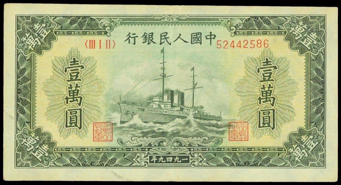 People’s Bank of China,1st series renminbi, 10000 yuan, 1949, serial number III I II 52442586,green on pale yellow underprint, ‘Warship’, watermark, reverse brown,