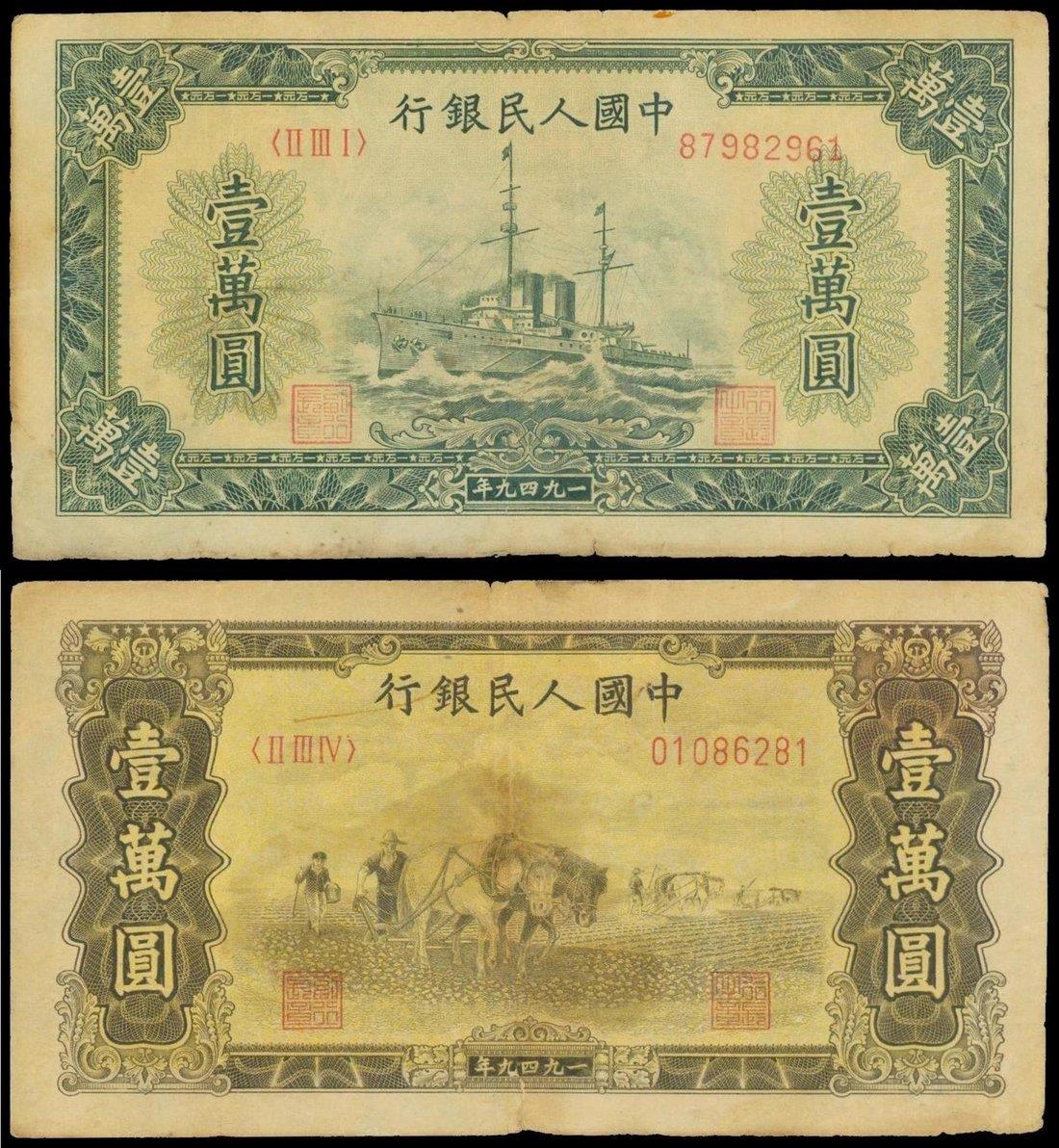 People's Bank of China, 1st series renminbi, 10,000 Yuan 'Warhsip' and 10,000 Yuan 'Two Horses Ploughing', both with watermarks,