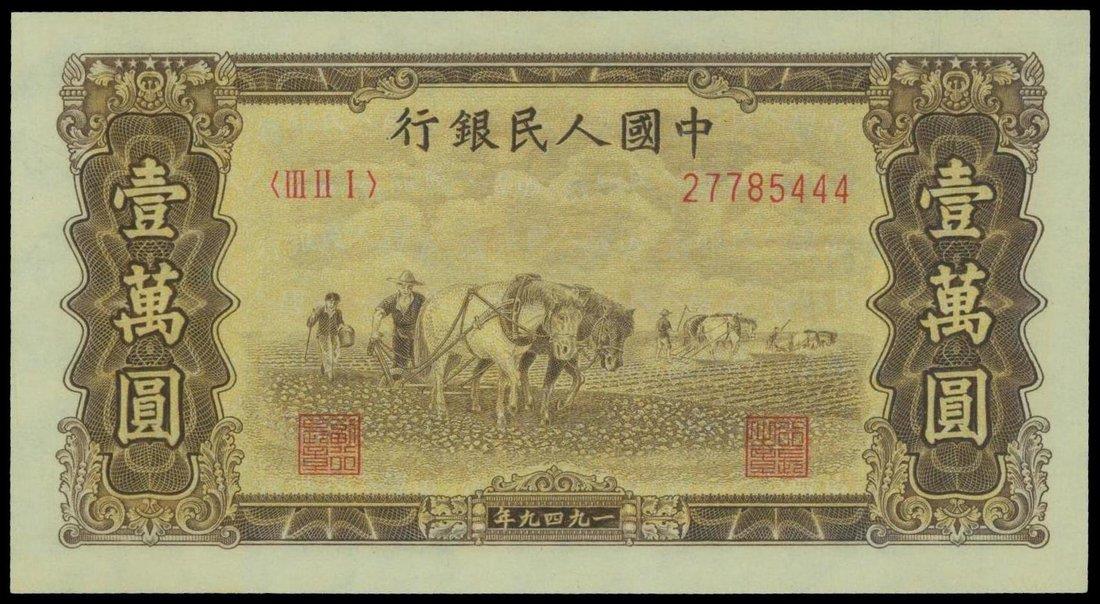 People’s Bank of China,1st series renminbi, 10000 yuan, 1949, serial number III II I 27785444,brown, horses ploughing, reverse grey-brown,