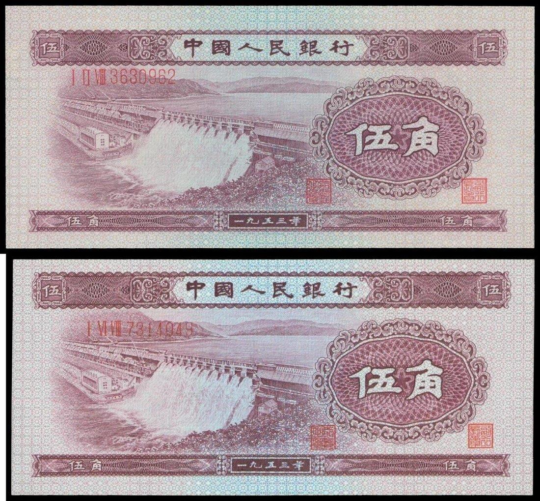 People’s Bank of China,a pair of 5 jiao, 1953, serial number I VI VIII 7314049, I II VIII 3630962,violet on lilac and blue underprint, dam at left, one with star watermark,