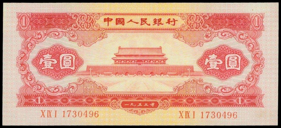 People's Bank of China, 2nd series renminbi, 1 yuan, 1953, serial number X IX I 1730496, red, Tiananmen at centre,