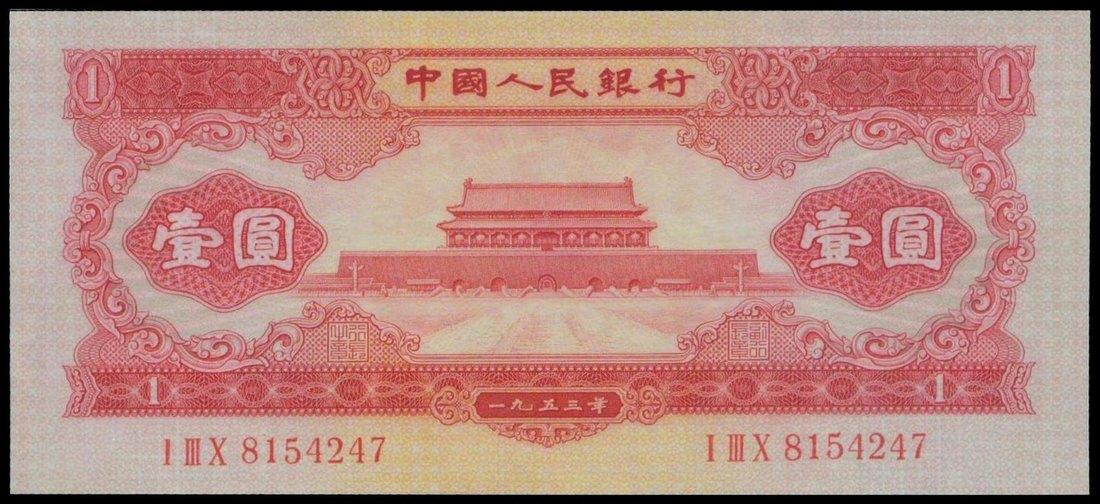 People's Bank of China, 2nd series renminbi, 1 yuan, 1953, serial number I III X 8154247, red and yellow, Tiananmen at centre,