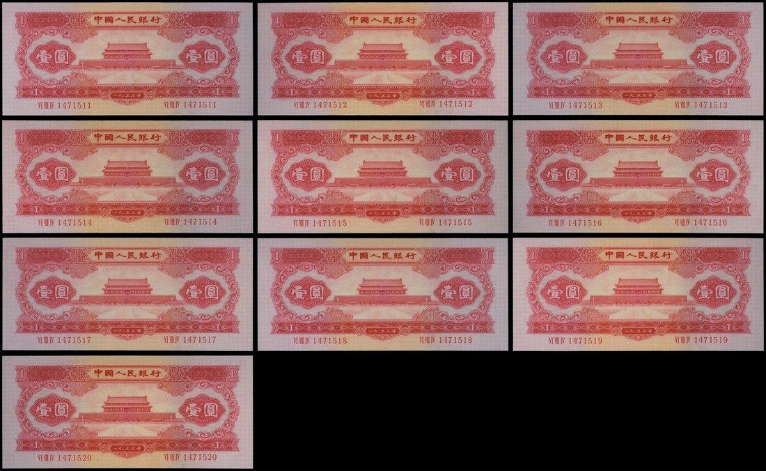 People’s Bank of China,consecutive run of 10 x 1 yuan, 1953, serial number VI VIII IV 1471511-20,red and pale orange, Great Hall at centre, reverse red and yellow, National Amblem at centre,