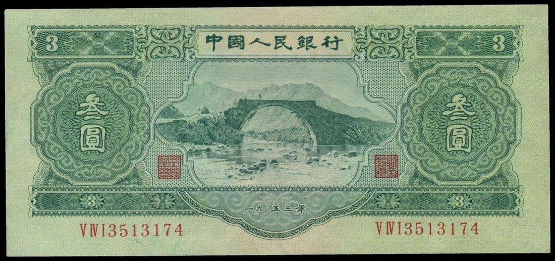 People’s Bank of China,3 yuan, 1953, serial number V IV I 3513174,green and black on light orange underprint, old bridge at centre, reverse green, arms at top centre,