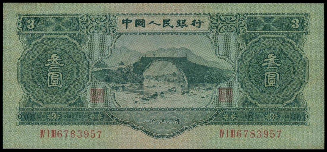 People’s Bank of China,3 yuan, 1953, serial number IV I III 6783957,green and black on light orange underprint, old bridge at centre, reverse green, arms at top centre,