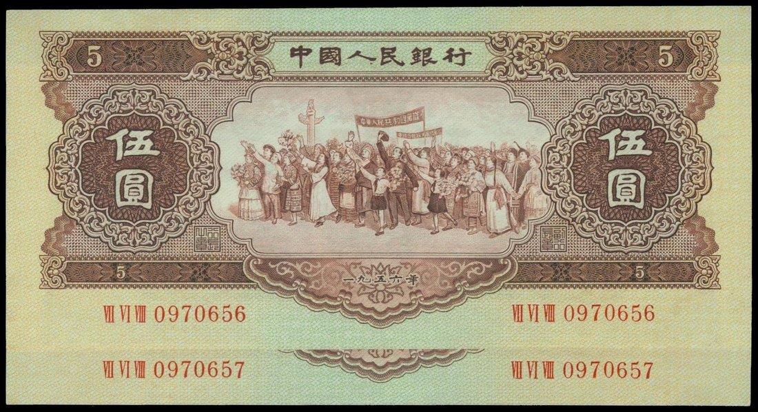 People’s Bank of China,consecutive pair of 5 yuan, 1956, serial number VII VI VIII 0970656-7,dark brown on pale green, demonstrators at centre, watermark of star ,