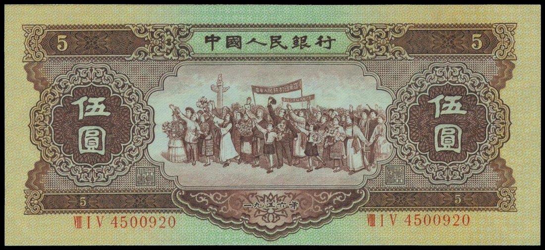 People’s Bank of China,5 yuan, 1956, serial number VIII I V 4500920,dark brown on pale green, demonstrators at centre, watermark of star and wings/seagull,