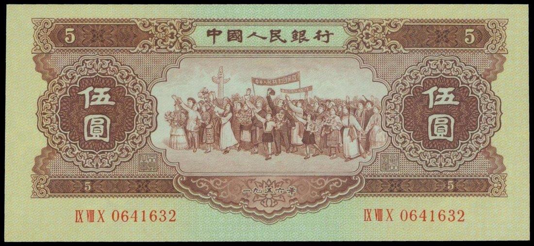 People's Bank of China, 2nd series renminbi, 5 yuan, 1956, serial number IX VIII X 0641632, yellow and brown, crowd of demonstrators at centre,