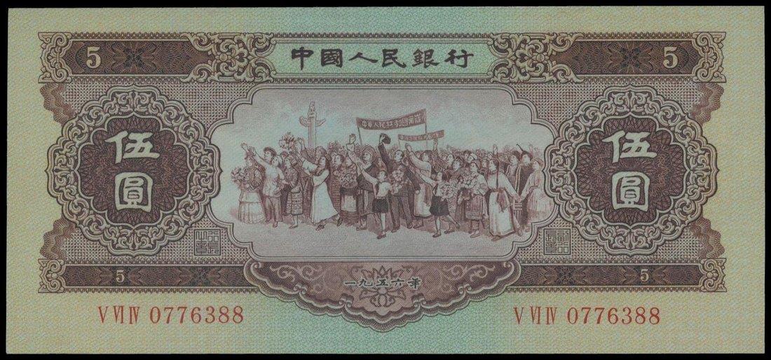People’s Bank of China,5 yuan, 1956, serial number V VI IV 0776388,dark brown on pale green, demonstrators at centre, watermark of star ,