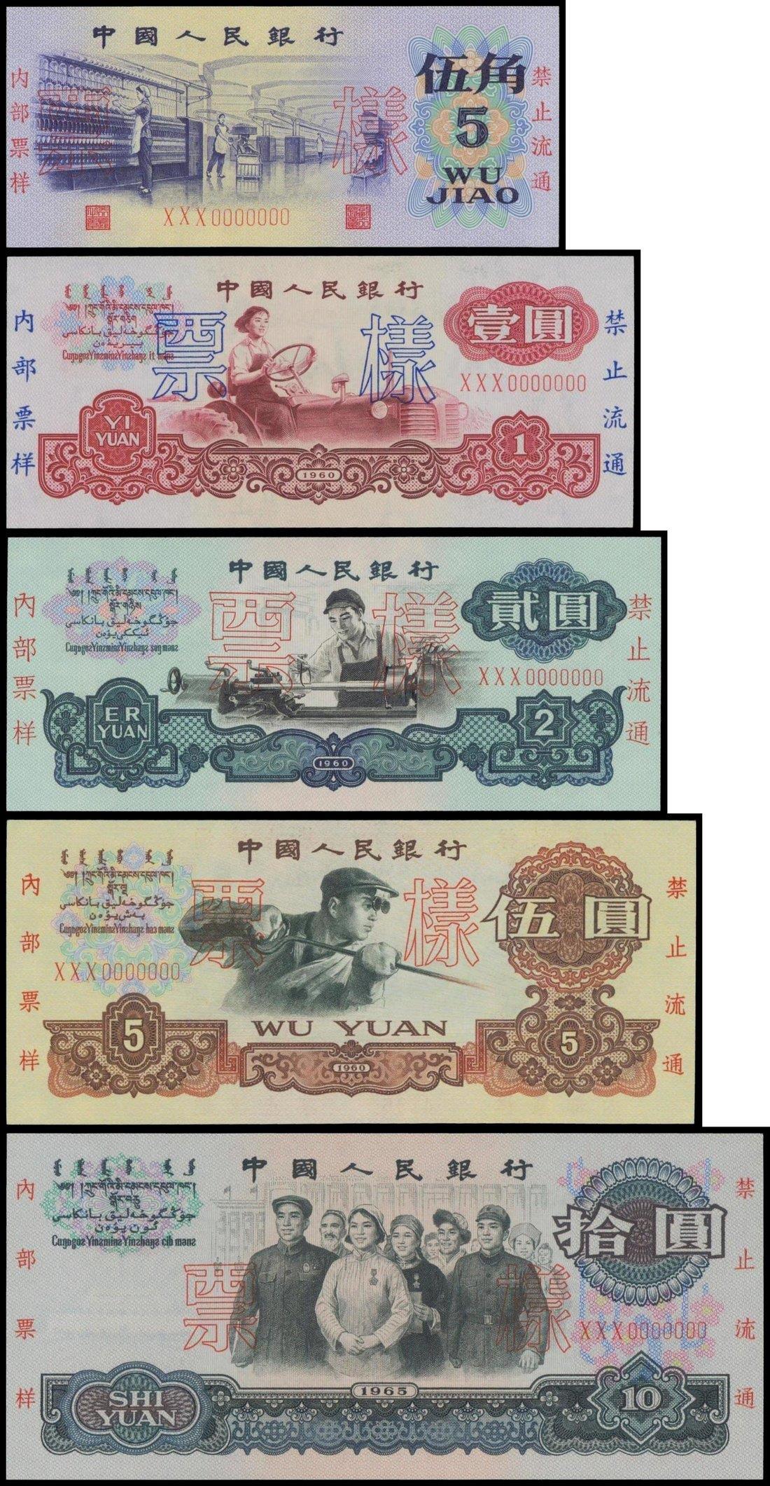 People's Bank of China, 3rd series renminbi, partial set of specimens, 5 jiao, 1, 2, 5 and 10 yuan, 1960-1972,