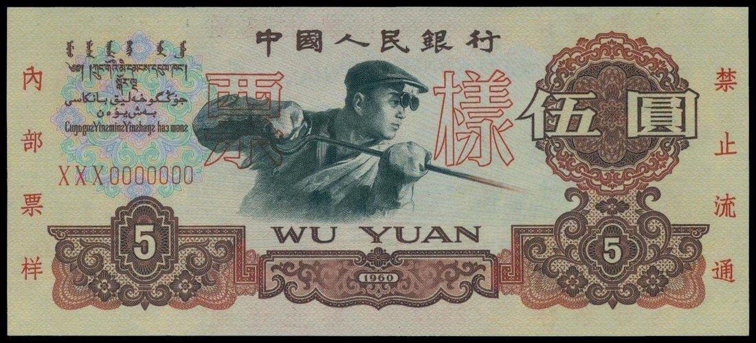 People’s Bank of China,3rd series renminbi, 5 yuan, 1960, specimen,brown and multicolour, foundry worker at centre, star watermark, red Chinese text overprinted on obverse and reverse,